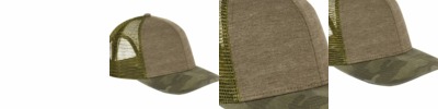 100% cotton front panel and visor; 100% nylon mesh back panel; 6-panel, unstructured, low-profile, pre-curved visor; Pigment-dyed front panels with contrast stitiching (matches back panels); Traditional tan nylon mesh back panels; Self fabric strap with adjustable antique brass slider back closure; Four-row stitching on visor;