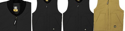 10 oz., heavy-duty cotton duck; Heavyweight quilt-lined taffeta; Water-repellent finish; Full-cut arm openings for maximum comfort; Extra large front patch pockets; Three inside pockets; Extended back for extra warmth;