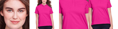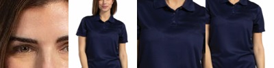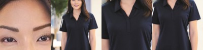 6 oz./yd2 / 210 gsm, 100% polyester pique; ChromaSoft™ technology combines the colorfastness of cationic dyes with soft cotton-feel performance; Moisture-wicking and antimicrobial performance; Feminine Y-neck placket with button detail; Self-fabric collar and integrated collar stays; Dyed-to-match buttons; Side vents; Tear away label;