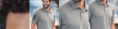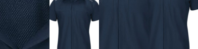 5.9 oz/yd2 / 200 gsm, 92% cotton, 8% Spandex jersey; Moisture-wicking and antimicrobial performance; Two-piece mandarin collar with hidden three-button placket; Dyed-to-match buttons; Side vents; Stretch performance; Active fit; Easy care;