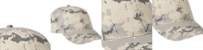 100% polyester; Sublimated poly fabric; One size fits most; 3-panel; Patented memory fit sweatband; Hook & Loop closure;