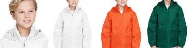 1.7 oz/yd2 / 58 gsm, 100% polyester taffeta; Water-resistant finish; Center front coil zipper with autolock slider; Lower front concealed zippered pockets; Elasticized cuffs; Rollaway hood;