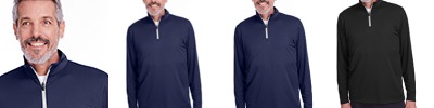 6.5 oz., 60% cotton 40% polyester single-dyed fleece; 1x1 rib yarn-dyed stripe inside collar, cuffs and waist; unconcealed brushed nickel ¼ zip placket ; self fabric side gussets with side welt pockets;
