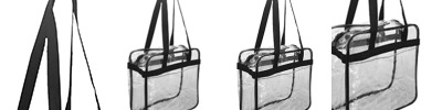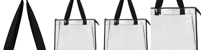 100% PVC; double zipper pull made with 600d material; transparent tote bag made with double-polished; 6" gusset; 29.5” carrying handles; stadium compliant; 12” x 12 ”x 6”;